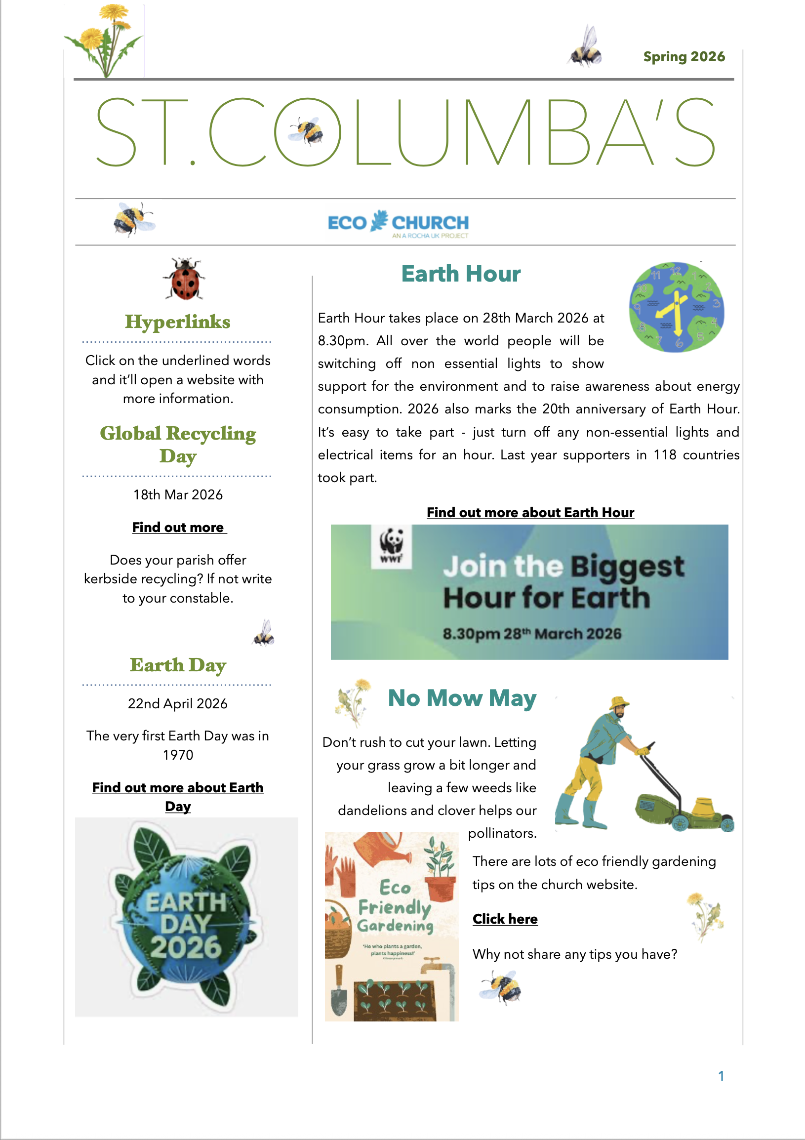 At St. Columba's church we aim to take the practical steps necessary to realise the Fifth Mark of Mission “To strive to safeguard the integrity of creation and sustain and renew the life of the earth”.